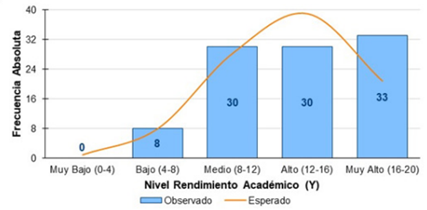 La distribución de frecuencias de la variable Rendimiento Académico (Y) se muestra en la Figura 4. El conjunto de datos muestra una media de 13.36 puntos y una desviación estándar de 3.93 puntos. El sesgo de la muestra tiene un valor de -0.13, lo cual indica que la mayoría de los datos se encuentran detrás de la media, mientras que su curtosis vale -1.13, lo cual indica que es menos puntiaguda que una distribución normal. Se observa que el grupo de rendimiento muy alto es el más frecuente, con 33 casos, mientras que el grupo menos frecuente es el de bajo rendimiento, con 8 individuos dentro de esta categoría.