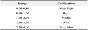 Se utilizó la encuesta como técnica principal. Para analizar la variable violencia, se aplicó el Cuestionario de Violencia Entre Novios (CUVINO), validado en España, México y Argentina. Este instrumento constaba de 42 ítems agrupados en 8 dimensiones: desapego, humillación, aspectos sexuales, coerción, violencia física, roles de género, castigo emocional e instrumental. Las respuestas se registraron en un formato Likert de cinco opciones (0 = nunca, 4 = muy frecuentemente). El cuestionario mostró cargas factoriales entre .37 y .77, con una consistencia interna (alfa de Cronbach) que osciló entre .68 y .82 (Rodríguez et al., 2010). Para el procesamiento de la información, se establecieron rangos según la Tabla 1.