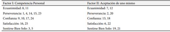 Para evaluar la variable resiliencia, se aplicó la Escala de Percepción de Resiliencia desarrollada por López-Figueroa y González-Rivera (2019). Este instrumento midió cinco dimensiones: ecuanimidad, sentirse bien solo, confianza en sí mismo, perseverancia y satisfacción personal. La escala constaba de 25 ítems distribuidos en dos factores: competencia personal y aceptación de uno mismo. Los ítems asociados a cada dimensión se describieron en la tabla 3, mientras que los datos se procesaron según los rangos de la Tabla 4.