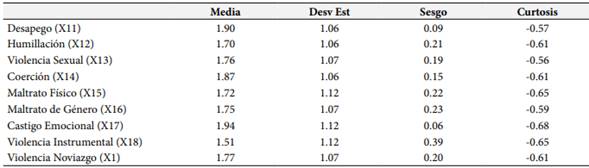 A continuación, se presentan los principales indicadores estadísticos para la variable Violencia en el Noviazgo (X1) y sus dimensiones como se muestra en la Tabla 6. Se reporta que el mayor promedio tiene un valor de 1.51 y corresponde a la dimensión Violencia Instrumental (X18), mientas que el mayor promedio es de la dimensión Castigo Emocional (X17), con un valor de 1.94. Midiendo la dispersión de los datos a través de la desviación estándar, se reporta que las dimensiones Desapego (X11), Humillación (X12) y Coerción (X14) poseen la menor desviación, con un valor de 1.06; mientras que el máximo valor de desviación es 1.12 y corresponde a las dimensiones Maltrato Físico (X15), Castigo Emocional (X17) y Violencia Instrumental (X18).
