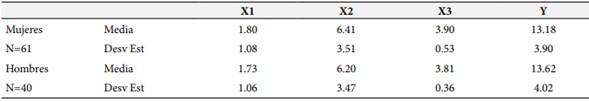 Se reportan las medias y desviaciones por sexo para las variables de estudio en la Tabla 8. No se reportan diferencias significativas (p>0.05) entre sexos para los factores analizados, por lo cual, no se encontró evidencia suficiente para afirmar que, en la muestra analizada, el sexo sea un factor determinante en los niveles de violencia de pareja, infidelidad virtual, resiliencia o desempeño académico.