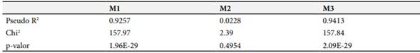 El modelo M1 reporta un pseudo R2 de 0.9257, el cual significa que es capaz de explicar el 92.57% de la variabilidad natural de los datos; para determinar si esa cantidad es significativa, se realiza una prueba de chi cuadrado de bondad de ajuste, la significancia de la prueba es inferior a 0.05, lo cual permite afirmar que existe una relación significativa entre las dimensiones de la violencia de pareja y el desempeño académico. El modelo M2 es capaz de explicar solamente el 2.28% de la incertidumbre total del modelo, cantidad que no es significativa en base a los resultados de la prueba de chi cuadrado, por lo que no existen evidencias suficientes para afirmar la existencia de una relación entre las dimensiones de la resiliencia y el desempeño académico. Finalmente, el modelo M3 es capaz de explicar el 94.13% de la variabilidad de los datos, los resultados de la prueba de chi cuadrado permiten afirmar la significancia del modelo y por tanto establecer que el conjunto de las tres variables independientes (violencia de pareja, infidelidad en redes sociales y resiliencia) poseen una relación estadísticamente significativa con el desempeño académico.