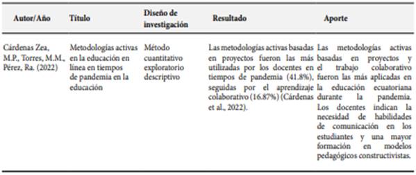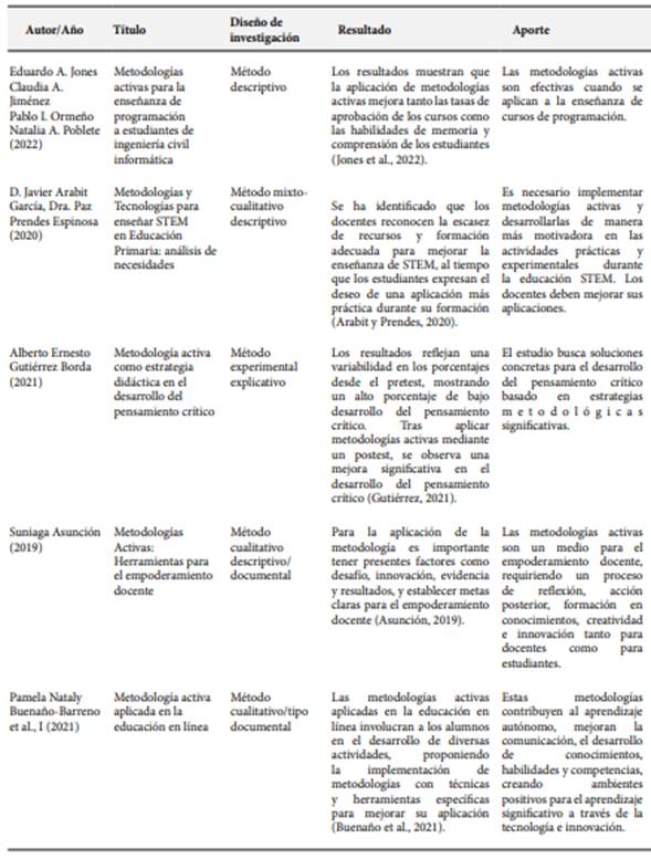 La revisión sistemática permitió una revisión exhaustiva y crítica de la literatura relevante, garantizando que solo los estudios más pertinentes y de alta calidad fueran considerados en el análisis final. En la Tabla 1 se proporciona un grupo de estudios que forman parte de una base sólida para analizar la metodología activa en la educación técnica.