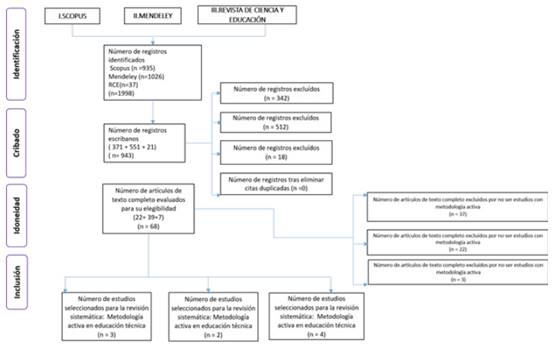 El presente artículo se fundamentó en la sistematización de la literatura sobre metodologías activas. Para ello, se realizaron búsquedas exhaustivas en bases de datos académicas reconocidas, tales como Scopus, Mendeley y diversas revistas especializadas en la ciencia de la educación. Inicialmente, se obtuvieron 1998 artículos relacionados con el tema de interés. Posteriormente, se aplicaron filtros específicos para refinar los resultados. Se utilizó el operador booleano "AND" en combinación con términos relevantes, lo cual permitió reducir el número de artículos a 1126, expulsando 872 artículos que no cumplían con los criterios de relevancia. Un tercer filtrado se llevó a cabo utilizando la palabra clave "Educación", lo que resultó en 943 artículos que se aproximaban mejor a los conceptos en estudio.