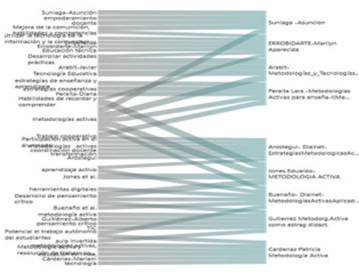 El diagrama de Sankey presentado en la Figura 3 ilustra de manera clara la interrelación entre los diferentes autores cuyos artículos fueron incluidos en la revisión literaria sobre metodologías activas. Este diagrama evidencia cómo las investigaciones convergen en ciertos puntos clave y complementan sus hallazgos, destacando la riqueza y profundidad del enfoque en la educación técnica.