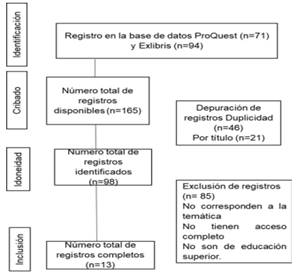 La búsqueda inicial arrojó un total de 165 estudios (43 % de ProQuest y 57 % de ExLibris). Tras la aplicación del método PRISMA, se llevó a cabo un proceso de cribado y evaluación, seleccionándose finalmente 13 artículos para su análisis como se evidencia en la Figura 1.