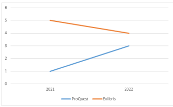 En la Figura 2 se observa que 6 artículos fueron desarrollados en el 2021; mientras que 7 que fueron publicados el año 2022. Asimismo, se determina que en la base de datos Exilibris se tiene mayores publicaciones sobre el tema, registrándose 9 estudios a diferencia de ProQuest que solo registra 4.