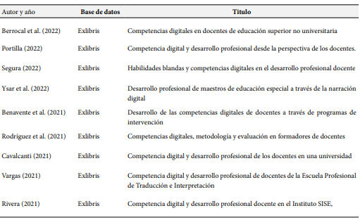 En la Tabla 1 se presentan los estudios seleccionados para analizar las competencias digitales y el desarrollo profesional docentes, en ella se presenta la base de datos de donde se extrajo, año de publicación y título de estudio.