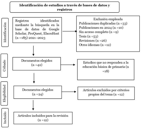 En el artículo se empleó la metodología desarrollando un análisis teórico documental y bibliográfico. Para ello se realizó una revisión de fuentes científicas que contribuye a responder la interrogante de la investigación. La revisión sistemática respondió a los criterios de elegibilidad previamente establecidos para responder a la pregunta de investigación. Respecto al método utilizado fue el sistemático debido que se brinda una visión global permitiendo comprender la complejidad del estudio, identificar su relación con otras variables, fomentar la colaboración con otras disciplinas y brindar soluciones efectivas para el ámbito educativo. Asimismo, por medio de un enfoque descriptivo se construye el conocimiento facilitando el aprendizaje sobre las estrategias pedagógicas para la producción de textos en los estudiantes. Por ello, la búsqueda y selección se dieron de revistas científicas de la base de datos de ProQuest, EbscoHost. Los años de búsqueda comprendieron entre el 2021 al 2023. Como palabras clave se emplearon los términos: “producción de textos”, “competencia lingüística”, “educación primaria”. En los criterios de inclusión, se consideró artículos de las dimensiones sobre la producción de textos y estrategias pedagógicas que permitan optimizarla.