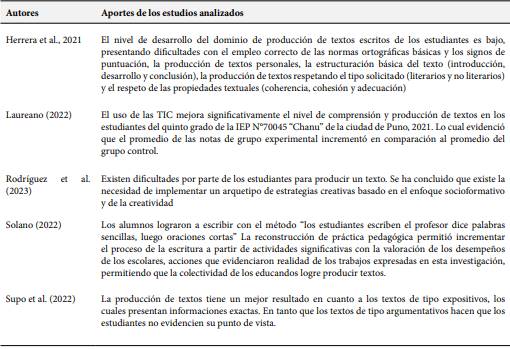 De los 185 artículos identificados, se procedió a realizar una búsqueda de información considerando los criterios de inclusión por lo que fueron seleccionados solamente 12 estudios para el desarrollo de la revisión sistemática. En la Tabla 1 se presentan los principales aportes de las investigaciones, los cuales brindan un análisis descriptivo de cómo las estrategias pedagógicas impactan en el desarrollo de la producción de texto en los estudiantes.