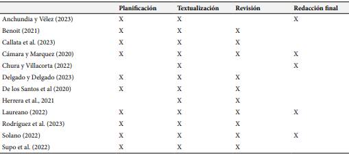 En la Tabla 2 se presentan los tres procesos propuestos por Cassany, los cuales son aplicados en la mayoría de las investigaciones. De los estudios revisados, 9 autores consideran los tres procesos -planificación, textualización y revisión- como estrategias pedagógicas clave para la producción de textos. En contraste, un estudio destaca solo la planificación y la textualización, otro sugiere que la combinación de textualización y revisión es suficiente, y un último se enfoca exclusivamente en la textualización y la revisión final.