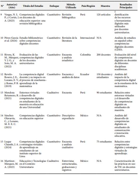 En la Tabla 1, se presenta la sistematización de las fuentes de los estudios sobre competencias digitales de docentes universitarios, organizada en función de su enfoque (cuantitativo, cualitativo, teórico) y los elementos relevantes para la investigación.