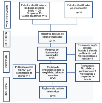 Los artículos fueron organizados en una tabla con información sobre autor, año de publicación, metodología, lugar de procedencia y análisis. Los criterios de exclusión contemplaron la eliminación de artículos publicados fuera del rango temporal establecido, duplicados, irrelevantes para la temática y aquellos cuyos resúmenes no contenían el objetivo, metodología, desarrollo, discusión y conclusión (Figura 1).
