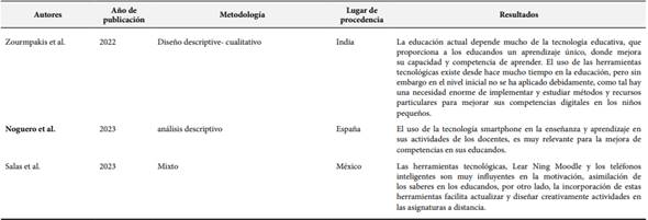 Los avances de la información no es la tecnología de los educandos es la, tecnología de los educadores, ya que el estudiante no aprende la tecnología informativa moderna sino, ellos lo utilizan como un medio técnico de enseñanza. El docente se capacita en la utilización de las tecnologías modernas para mejorar las actividades de la educación y llevar el más alto nivel de información a los estudiantes (Shirinboy y Dilfuza, 2022). También existen negativas por parte de algunos participantes al uso de la tecnología, la cual limita el desarrollo de la enseñanza de las asignaturas por eso la escasa interacción de los docentes y educandos condujo a la poca connotación pedagógica (Padilla et al. 2022). La educación actual depende mucho de la tecnología educativa, que proporciona a los educandos un aprendizaje único, donde mejora su capacidad y competencia de aprender, pero sin embargo en el nivel inicial no se ha aplicado debidamente, como tal hay una necesidad enorme de implementar y estudiar métodos y recursos particulares para mejorar sus competencias digitales en los niños pequeños (Zourmpakis et al., 2022). Es así que se llega a una conclusión que las herramientas tecnológicas generan interaprendizaje, mediante un aprendizaje colaborativo y continuo (Ruiz et al., 2022).