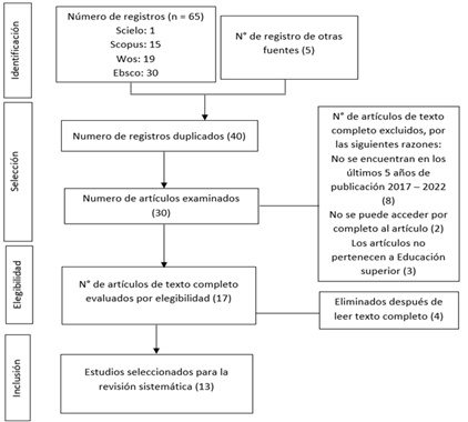 Se excluyeron los siguientes tipos de artículos aquellos que no estaban relacionados con la educación superior, artículos incompletos o aquellos que solo presentaban resúmenes, y artículos duplicados.