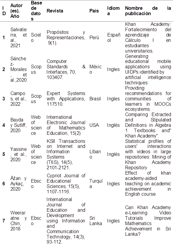 Los artículos seleccionados cumplían con los siguientes requisitos publicados en revistas de alto impacto, indexadas en bases de datos reconocidas como Scopus, Scielo, Ebsco, Web of Science, entre otras; artículos publicados en los últimos cinco años; investigaciones en idiomas español e inglés, y relevancia directa con el uso de Khan Academy en la educación superior.