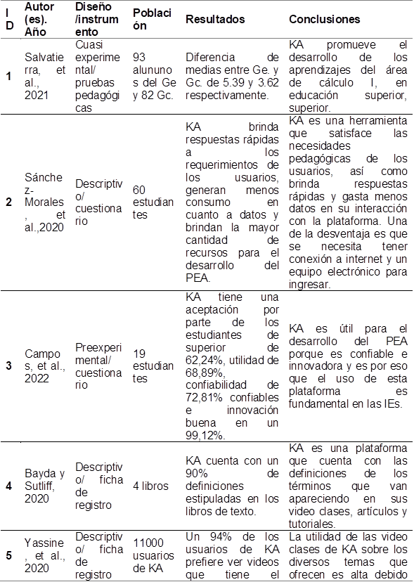 A continuación, en la Tabla 2 se presenta el análisis sistematizado de las fuentes encontradas para la revisión sistemática relacionado con el objetivo del estudio como lo es el análisis de la utilidad de la plataforma KA en la educación superior mediante una revisión sistemática de estudios publicados entre 2017 y 2022.