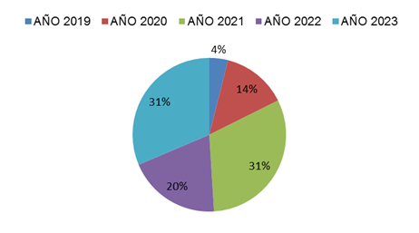 En la Figura 3 se representa el porcentaje de investigaciones revisadas según el año de publicación, donde el 4% de las investigaciones seleccionadas fueron publicadas en el año 2019, el 14% en el año 2020, el 20% en el año 2022, el 31% del año 2021 y el 31% del año 2023. Estos resultados dejan en evidencia que los estudios seleccionados fueron publicados entre el año 2019 y 2023. La minoría de las investigaciones revisadas fueron publicados en el año 2019 y la mayoría corresponden a los años 2021 y 2023.