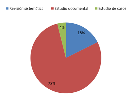 En la Figura 6 se representa el diseño metodológico de las investigaciones revisadas, el 2% corresponde a un estudio de caso, el 4% es una revisión documental, el 18% es una revisión sistemática y el 78% es una investigación de campo. Por lo que se tiene que la minoría de las investigaciones revisadas fueron un estudio de caso y la mayoría un estudio de campo.