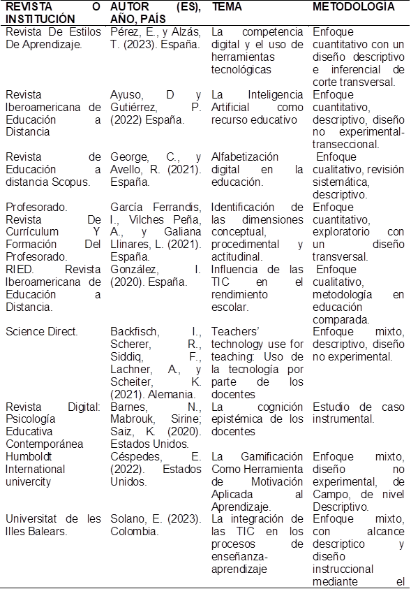 La sistematización de la Tabla 1 muestra un panorama amplio sobre el uso e impacto de las Tecnologías de la Información y Comunicación (TIC) en la educación, abarcando estudios de diversas revistas e instituciones a nivel internacional. Se identifican tendencias clave, como la alfabetización digital, la inteligencia artificial en la enseñanza, la gamificación, el aprendizaje en entornos virtuales y la integración de herramientas digitales en los procesos educativos. Las metodologías empleadas incluyen enfoques cuantitativos, cualitativos y mixtos, con diseños descriptivos, correlacionales y experimentales, lo que permite una visión integral de cómo la tecnología está transformando la educación en distintos contextos.