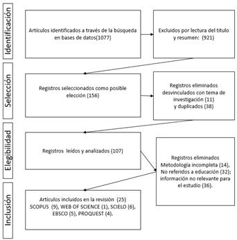 Como criterio de exclusión, se descartaron los artículos sin relevancia, fuera del rango de fecha de publicación (últimos cinco años 2019-2023), seleccionándose 156 estudios luego de eliminar los duplicados y con temáticas distintas a esta investigación. Para el análisis de elegibilidad se consideraron los documentos en extenso, las palabras clave, el tipo de metodología, los instrumentos descritos, los objetivos del estudio, la población, resultados y las referencias empleadas, obteniéndose 25 investigaciones. En la Figura 1 se presenta el flujograma PRISMA.