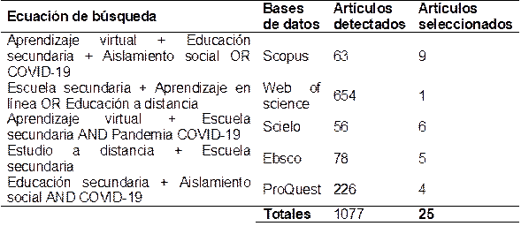 Para el refinamiento de la búsqueda se realizó la exploración de los términos mediante el Thesauro de la UNESCO, con los descriptores: Estudio a distancia, Sistemas de aprendizaje abierto, Educación a distancia, Aprendizaje virtual, E-learning, M-learning, Aprendizaje en línea, Aprendizaje electrónico, Escuela secundaria, Educación secundaria, Pandemia de COVID-19, Aislamiento social (Distance study, Open learning systems, distance Education, Virtual learning, E-learning, M-learning, Online learning, Electronic learning, secondary school, secondary Education, COVID-19 pandemic, Social isolation). Además, se aplicaron ecuaciones con los operadores booleanos “AND” y “OR” (Tabla 1).