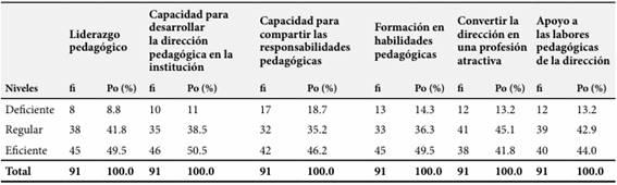 Tabla 1. Niveles y frecuencia de la variable liderazgo pedagógico y sus dimensiones