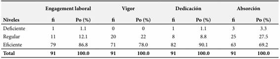 Tabla 2. Niveles y frecuencia de la variable engagement laboral y sus dimensiones