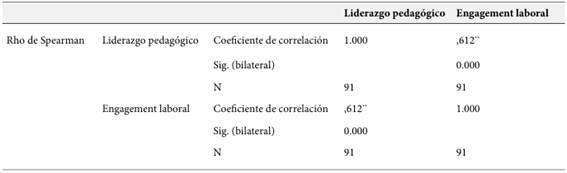 Tabla 3. Correlación de Rho de Spearman y nivel de significación entre el liderazgo pedagógico y el engagement laboral docente en institutos de educación superior públicos