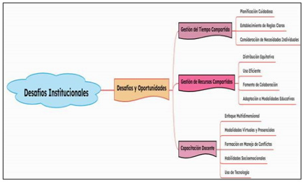 Desafíos institucionales: abarca un conjunto complejo de retos que las instituciones educativas deben abordar para fortalecer la capacidad institucional, la sustentabilidad y la resiliencia de sus sistemas. Estos desafíos incluyen la gestión eficiente del tiempo y recursos compartidos, la implementación efectiva de programas de capacitación docente, la integración de herramientas tecnológicas y enfoques de aprendizaje activo, así como la creación de ambientes de aprendizaje inclusivos y participativos. Las instituciones se enfrentan a la necesidad de adaptar sus prácticas pedagógicas y organizativas para responder a las nuevas demandas educativas, lo cual implica superar obstáculos como la limitación de recursos, la resistencia al cambio, y la necesidad de desarrollar habilidades digitales y socioemocionales tanto en docentes como en estudiantes (Cely et al., 2023; Galván et al., 2023; Juarez et al., 2023).