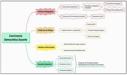 Finalmente, se constató que la convivencia democrática docente, Figura 3, frente a los desafíos y oportunidades surgidos durante la pospandemia revela una transformación significativa en las prácticas pedagógicas y dinámicas escolares. Las estrategias de adaptación pedagógica han integrado eficazmente herramientas tecnológicas y enfoques de aprendizaje activo, promoviendo la participación estudiantil y el pensamiento crítico. Las dinámicas de diálogo han fomentado un ambiente inclusivo y colaborativo, destacando la importancia de la escucha activa, la creación de espacios seguros y el cultivo de la empatía (EXP01, EXP02, EXP03).