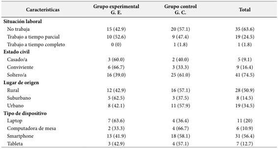 En la Tabla 1, la mayoría de los alumnos en ambos grupos son menores de 25 años, con un total del 94.5 % en esta categoría de edad. El sexo masculino predomina en la muestra, representando el 83.6 % del total de participantes. En términos de clasificación socioeconómica, la mayoría de los estudiantes (70.9 %) no son considerados pobres. Con respecto a la situación laboral, una proporción significativa de estudiantes (63.6 %) no trabaja, mientras que un 24.5 % trabaja a tiempo parcial y solo un 1.8 % a tiempo completo. En cuanto al estado civil, la mayoría son solteros (74.5 %). Los estudiantes provienen principalmente de áreas rurales y urbanas, con un 50.9 % y un 34.5 % respectivamente. Finalmente, en cuanto al tipo de dispositivo utilizado para el estudio, los smartphones son los más comunes (56.4 %), seguidos por laptops (20 %).