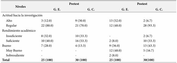 En la Tabla 3, inicialmente, ambos grupos mostraban una actitud mayormente regular hacia la investigación y un rendimiento que oscilaba entre insuficiente y suficiente. Tras la intervención, el grupo experimental exhibió mejoras significativas: un incremento notable en la actitud positiva hacia la investigación y un ascenso en los niveles de rendimiento, alcanzando categorías más altas como bueno, muy bueno y sobresaliente. En contraste, el grupo de control mostró cambios menos pronunciados, manteniendo en gran medida su actitud y mejorando ligeramente en rendimiento, pero sin alcanzar el nivel de progreso observado en el grupo experimental. Estos resultados sugieren un impacto positivo de la intervención, especialmente en el grupo experimental.