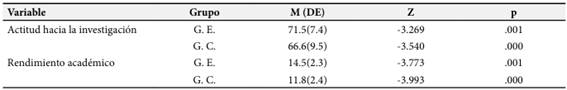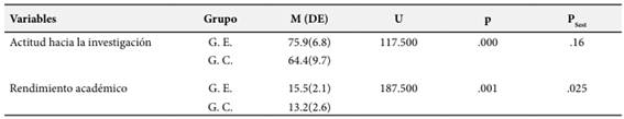 En la Tabla 2, los resultados muestran que, tanto en la actitud hacia la investigación como en el rendimiento académico del grupo experimental, mostró una mejora de las puntuaciones del pretest al postest. Además, el grupo de control evidenció una mejora en el desempeño académico, aunque menor que en el grupo experimental, y una reducción en la actitud hacia la investigación. Además, las diferencias en todos los grupos fueron estadísticamente significativa (p ≤ .05).