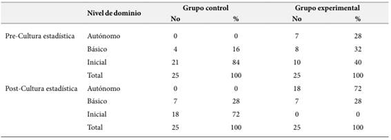 Tabla 1. Análisis comparativo de los resultados del grupo control y experimental en la dimensión de cultura estadística