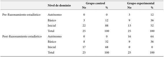 De manera similar la Tabla 2, muestra que en la fase de pre-intervención respecto a la dimensión razonamiento estadístico el grupo control no tenía estudiantes en el nivel autónomo, mientras que el grupo experimental contaba con un 12% de estudiantes en este nivel. En el grupo control, solo el 12% de los estudiantes se ubicó en el nivel básico, mientras que una gran mayoría del 88% se encontraba en el nivel inicial. Por otro lado, el grupo experimental tenía un 36% de estudiantes en el nivel básico y un 52% en el nivel inicial.