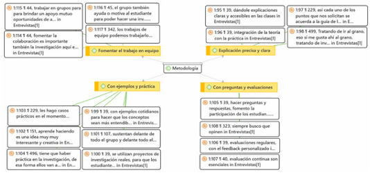 Con relación a la “metodología” los hallazgos por parte del estudiante indican que un docente con una buena metodología y experiencia es aquel que utiliza herramientas y estrategias que fomenten su interés y motivación a aprender investigación, creando un espacio educativo cómodo y de comunicación constante. De igual manera, los docentes mencionan que se aseguran de que sus estudiantes entiendan y aprendan investigación mediante preguntas constantes, ejemplos y evaluaciones en equipo. Además de identificar sus motivadores e intereses con el fin de crear un espacio de confianza. Por lo tanto, los estudiantes valoran el trabajo que realizan los docentes que impulsa su interés en la investigación; destacando la relevancia de actualizarse en enfoques pedagógicos.