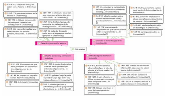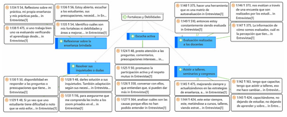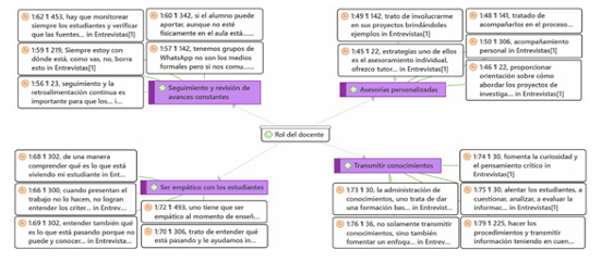 Se entrevistó a docentes mediante Zoom, analizando las respuestas con ATLAS.ti 23. Se exploró la categoría "interacción estudiante-docente" y sus subcategorías: dificultades, rol del docente, metodología, fortalezas y debilidades. Este análisis buscaba contrastar los datos con las respuestas de los estudiantes. La síntesis de los resultados con sus correspondientes códigos: "dificultades" con códigos como "Entender la metodología de la investigación", "rol del docente" con códigos como "Asesorías personalizadas", "metodología" con códigos como "Explicación precisa y clara", y "fortalezas y debilidades" con códigos como "Escucha activa". Donde los docentes enfatizan la importancia de la retroalimentación constante, el apoyo personalizado y la participación de los estudiantes en su proceso educativo. Asimismo, como resultado de la cantidad de códigos generados, se procedió a destacar a los códigos con mayor frecuencia de citas, solo con el fin de mejorar la lectura de las figuras. No obstante, se debe enfatizar que todos los códigos, incluso y no incluidos en las figuras, fueron considerados y mencionados en los resultados del estudio.