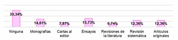 En la Figura 2, más del 30% de los estudiantes no han realizado investigaciones fuera de la universidad. El 70% restante se distribuye en distintos tipos de investigaciones: monografías (14,6%), cartas al editor (7,87%), ensayos (15,73%), revisiones de la literatura (6,74%), revisión sistemática (12,36%) y artículos originales (12,36%). Esto sugiere que quienes realizan investigaciones externas han diversificado sus actividades, explorando distintos formatos y estructuras.