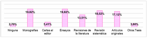 En la Figura 3, se destaca que las monografías (19.82%) y los ensayos (19.82%) son las investigaciones más comunes, seguidas de revisiones sistemáticas (18.02%), artículos originales (17.12%), revisiones de literatura (13.51%), y cartas al editor (5.41%). Un 3.6% mencionó la tesis como opción adicional, mientras que un 2.7% indicó no haber realizado ningún tipo de investigación en la universidad. Aunque la mayoría se enfoca en monografías y ensayos, también hay diversidad en otros tipos de investigaciones. No obstante, es destacable que muchos no realizan tesis o proyectos, lo que puede dificultar la elaboración de futuros proyectos de investigación después de graduarse.