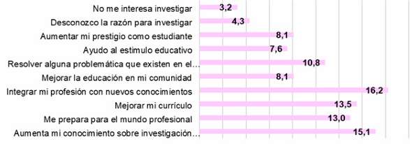 De igual manera, se buscó conocer las posibles razones internas y externas de que el estudiante realizara o no una investigación. En la Figura 4, se destacan los motivadores de cada estudiante para realizar investigación. "Integrar mi profesión con nuevos conocimientos" encabeza la lista con un 16.2%, seguido por "aumentar mi conocimiento sobre investigación científica" con un 15.1%. "Mejorar mi currículo" y "prepararme para el mundo profesional" tienen un 13.5% y 13%, respectivamente, mientras que otras opciones tienen menos del 11%. Estos motivadores principales reflejan la conciencia de los estudiantes acerca del valor de la investigación para su crecimiento personal y desarrollo profesional. Sin embargo, motivadores que benefician a otros son menos prioritarios, lo cual podría ser atribuible a su edad o a sus primeros pasos en la educación. Dada su futura labor como docentes en educación básica, donde transmitir conocimientos a mentes en formación es crucial, este aspecto merece consideración.