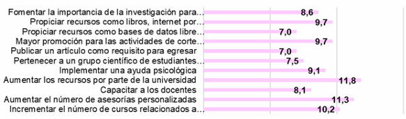 Además, se halló que sus principales incentivos fueron más apoyo por parte de la institución con recursos (11.8%) y soporte por parte de sus docentes (10.2%). Por lo que se puede inferir que los estudiantes no se encuentran satisfechos o no perciben ayuda por parte de su institución para realizar investigaciones. Sin contar que desean un mayor respaldo por sus docentes, quienes deberían brindarles una educación continua, elementos que coinciden con lo mencionado por Castro-Rodríguez (2019); Corrales-Reyes et al. (2019) y Magariño-Abreus et al. (2021) quienes advierten que para motivar los estudiantes a realizar investigación es necesario promocionar los beneficios y herramientas que tiene la institución universitaria y no solo brindarlos en los últimos años de su formación, como fue expuesto por Flores-Osorio (2018) y Urrea-Zazueta y Grijalva-Verdugo (2020).