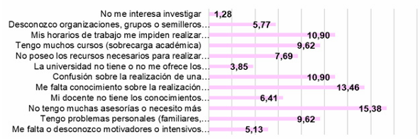 Se identificó que la falta de asesorías (15.38%) y la carencia de conocimientos para la investigación (13.46%) son los principales obstáculos para que los estudiantes realicen investigaciones, revelando cierto temor o incomodidad. Aunque los estudiantes se perciben con un alto nivel de conocimientos según la encuesta, la necesidad de ayuda de los docentes indica que el problema no está en sus conocimientos, sino en factores externos. Este hallazgo coincide con la investigación de Quintero-Gutiérrez (2020), que destaca la influencia crucial de la relación estudiante-docente en la percepción del progreso académico.