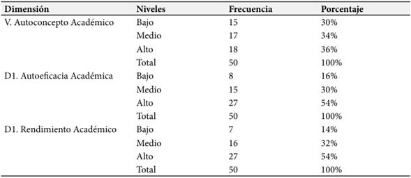 Tabla 1. Cuadro de frecuencias y porcentajes del autoconcepto académico de los estudiantes y sus dimensiones