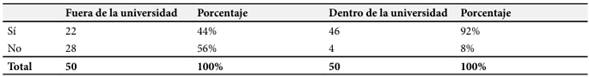 En la Tabla 2, el 92% de los estudiantes realiza investigaciones dentro de la universidad. En la Tabla 3, el 68% son colaborativas y el 32%, individuales. Las investigaciones externas constituyen la mitad de las internas, con solo 22 estudiantes participando. Este contraste refleja un patrón: muchos estudiantes muestran falta de interés en investigar fuera de la universidad, especialmente de manera individual.
