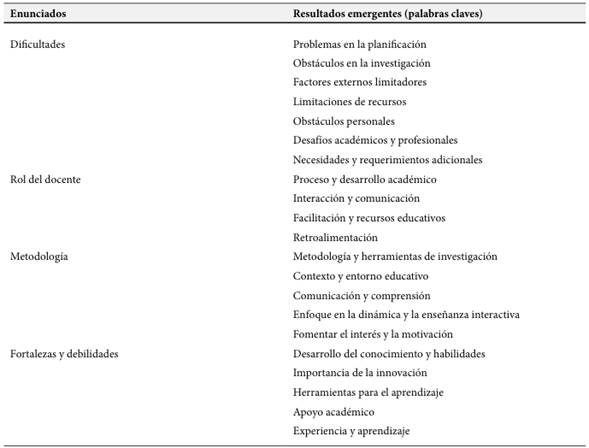 En la Tabla 5 se identificaron desafíos en la planificación de tiempo, recursos limitados, obstáculos personales y factores externos que afectan el proceso de aprendizaje. Estas complicaciones surgen de la falta de estrategias efectivas y recursos en la investigación, así como de dificultades personales como la falta de tiempo o responsabilidades familiares. La interacción y comunicación estudiante-docente son cruciales, especialmente para el desarrollo de habilidades y conocimientos. Se destaca la importancia de innovar y motivar para estimular el interés en la investigación. Además, proporcionar apoyo académico, recursos educativos y fomentar la experiencia es esencial para el aprendizaje.