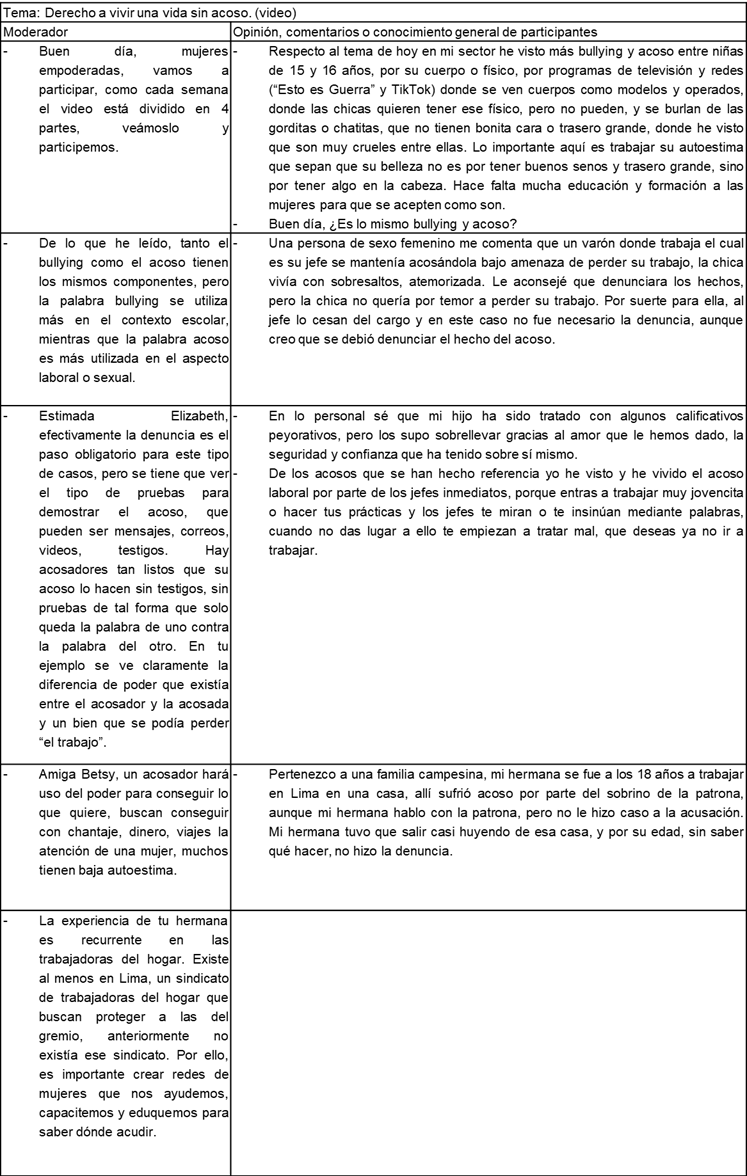 Según las vivencias compartidas por las participantes, en el territorio peruano, las personas, independientemente de su género, sufren constantemente acosos en diversos ámbitos, que incluyen lo familiar, educativo, social y laboral. El derecho fundamental de vivir sin ser objeto de acoso o violencia se ve amenazado, abarcando formas como la violencia de género, acoso sexual, acoso sexista, así como el acoso laboral e intimidación. Aunque existen normativas internacionales y nacionales destinadas a prevenir y combatir estos tipos de violencia, es crucial concientizar y educar a la sociedad sobre el impacto negativo del acoso y la violencia.