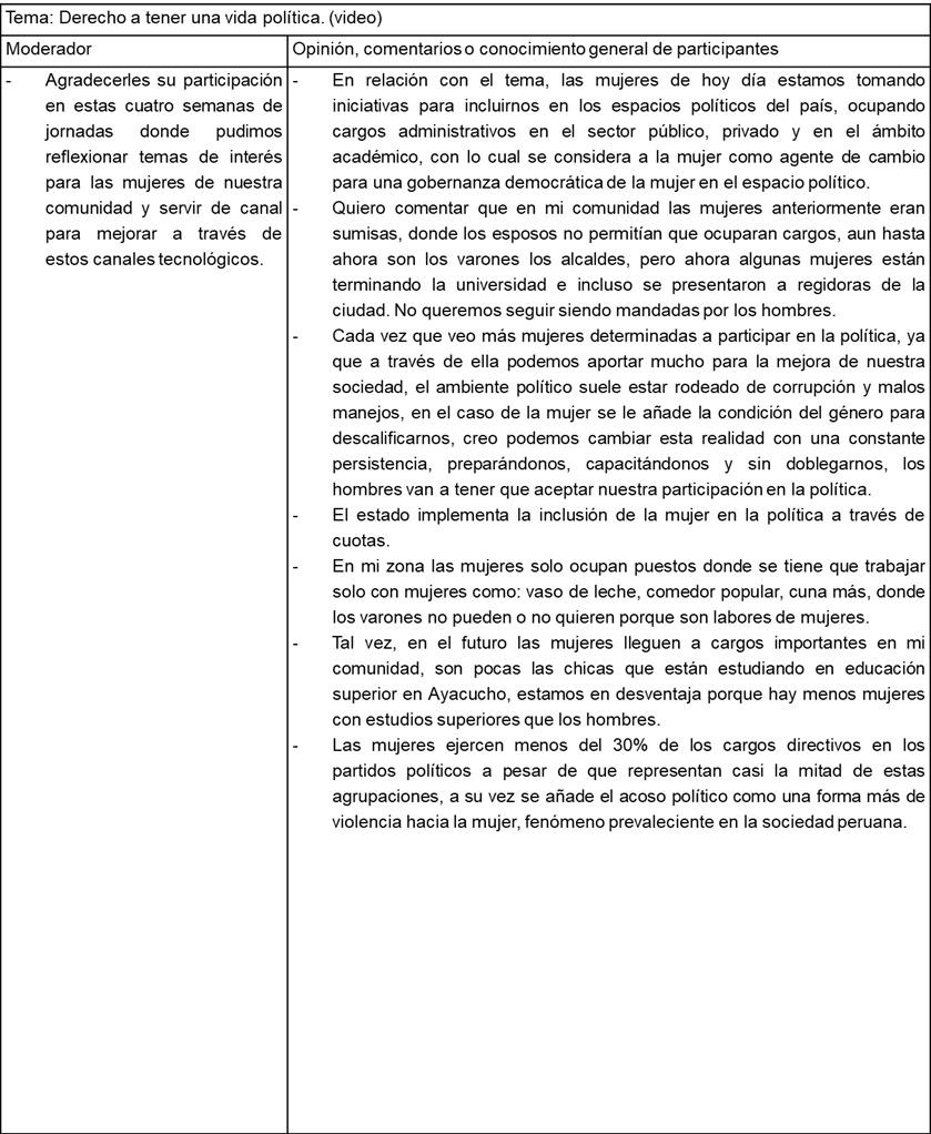 El derecho a una vida política implica la participación activa de las personas en la configuración de la voluntad estatal, la dirección de políticas gubernamentales y la integración en los órganos del Estado. En este contexto, la universidad, desde su compromiso con la Responsabilidad Social Universitaria, debe desempeñar un papel fundamental en la inclusión de la mujer peruana en la esfera política. Según lo manifestado por las participantes, las mujeres en zonas rurales experimentan una baja participación política debido a la escasa información y educación en este ámbito, destacando la necesidad de elevar los procesos de formación activa.