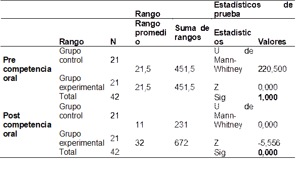 La interpretación de los resultados de la Tabla 2, para el pre test de la competencia oral es que la significancia asintótica bilateral es 1, mayor a 0.05, entonces se rechaza H1 y se acepta H0, indicándose que no existe una diferencia estadística significativa, para efectos del post test de la competencia oral se observa un valor asintótico de 0.000 menor a 0.05, aceptando el H1, sí existe diferencia significativa entre las medianas de los grupos experimental y control.