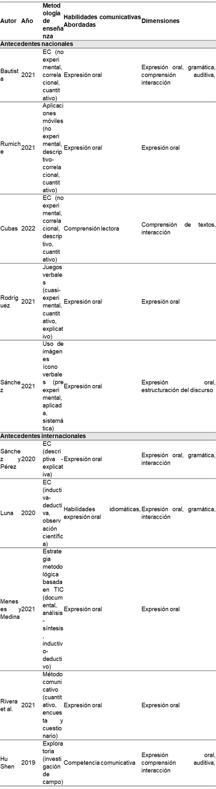 La revisión de la literatura reflejada en la Tabla 1, destaca diversas estrategias pedagógicas y sus impactos en las destrezas comunicativas de los alumnos, centrándose principalmente en la expresión oral.